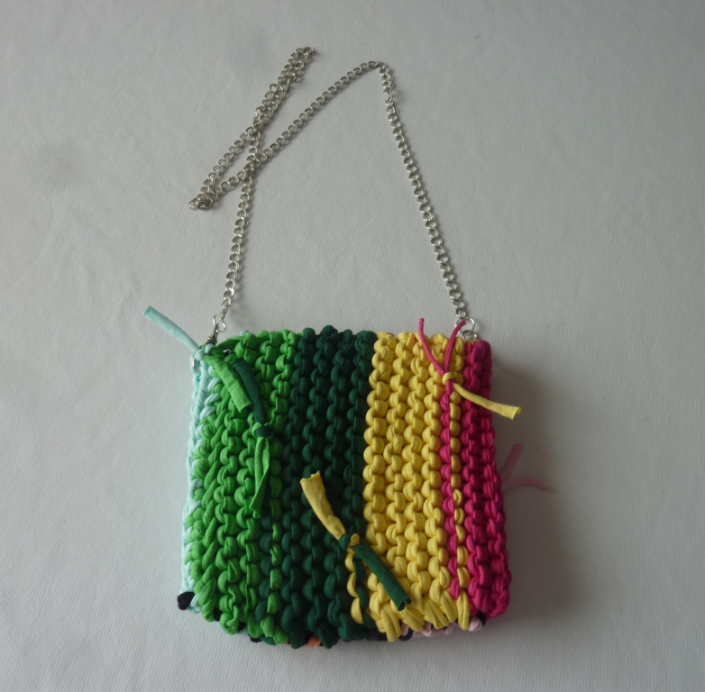 Este bolso esta tejido con trozos de trapillo y un lado es de unos colores y el otro de otros. Para colgar lleva una cadena de color plata.